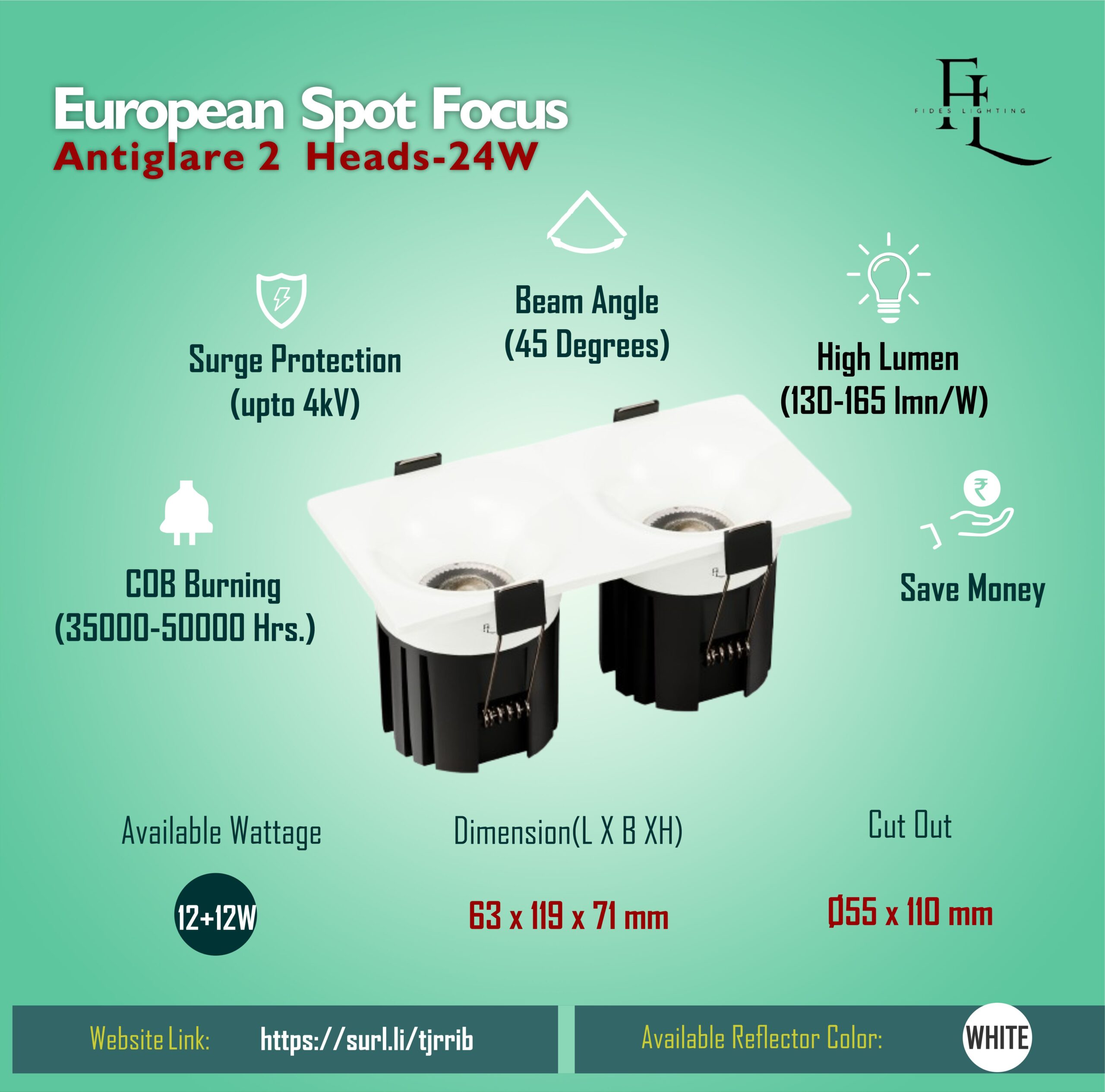 - Equipped with LM80 certified COBs 150lmn/Watt, ensuring long life of more than 50,000+ burning hours, with minimal lumen depreciation of the COB.